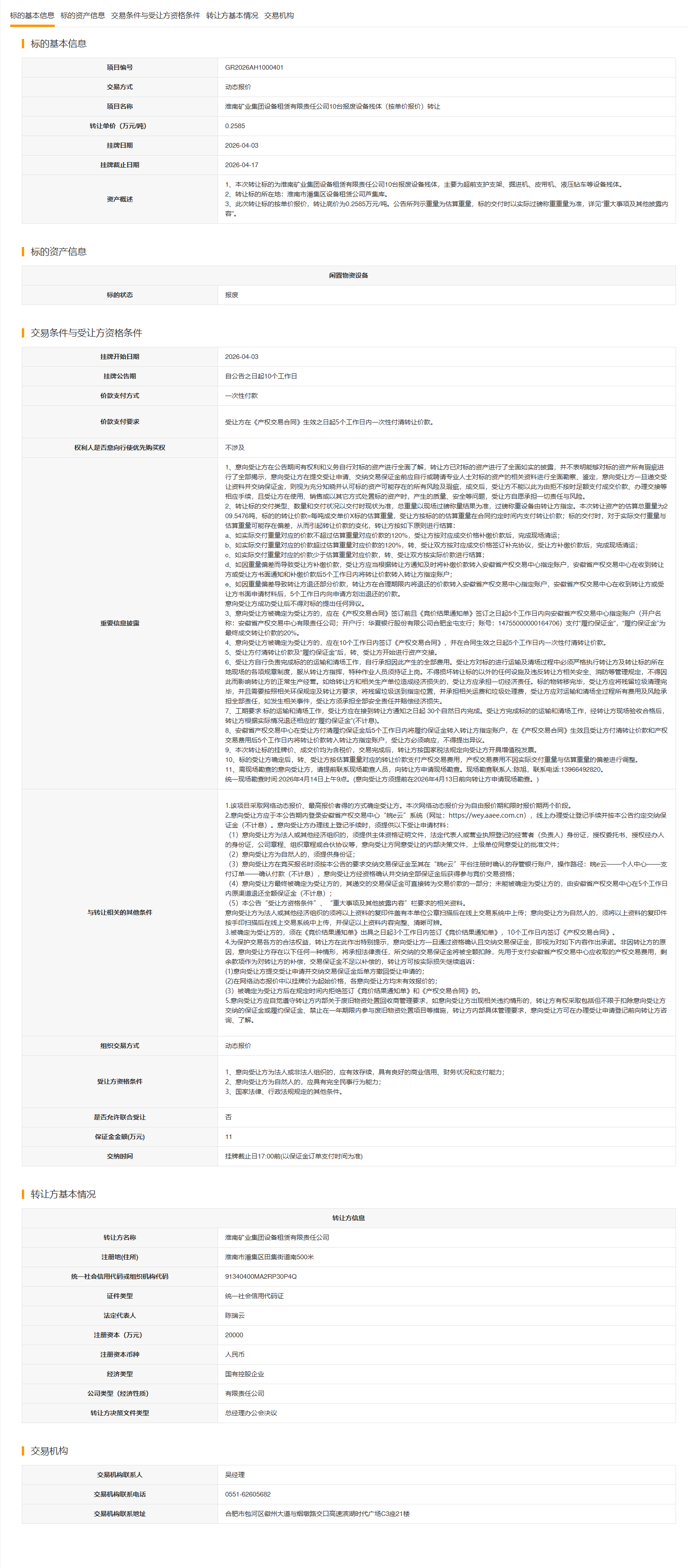 淮南矿业集团设备租赁有限责任公司10台报废设备残体(按单价报价)转让