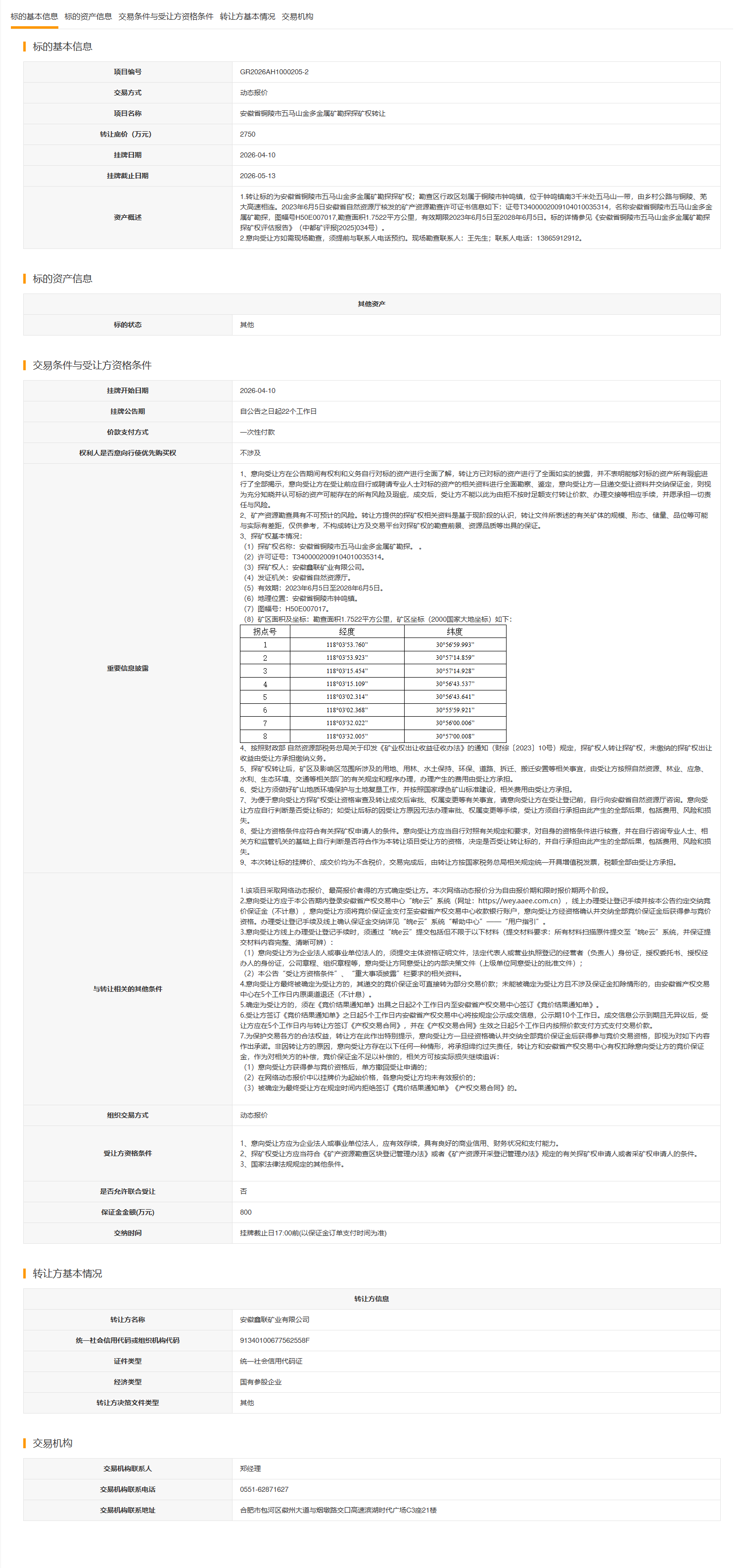 安徽省铜陵市五马山金多金属矿勘探探矿权转让