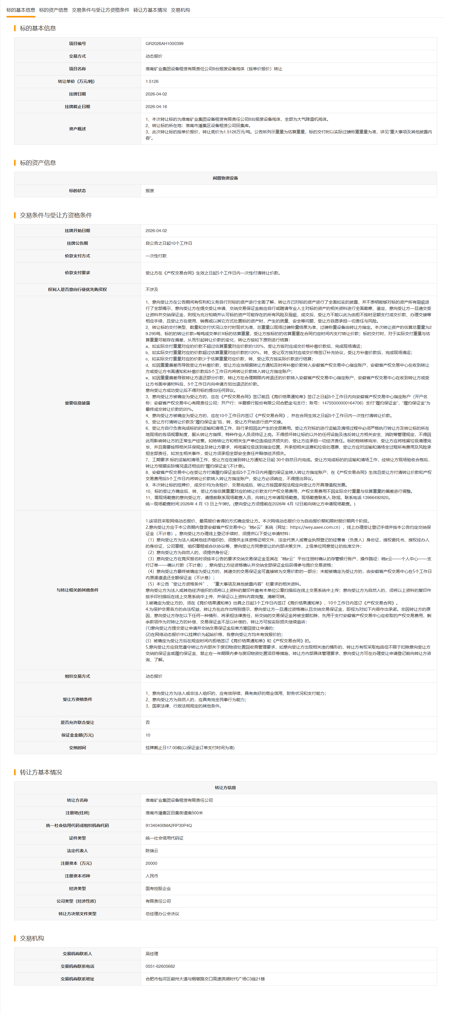 淮南矿业集团设备租赁有限责任公司8台报废设备残体(按单价报价)转让